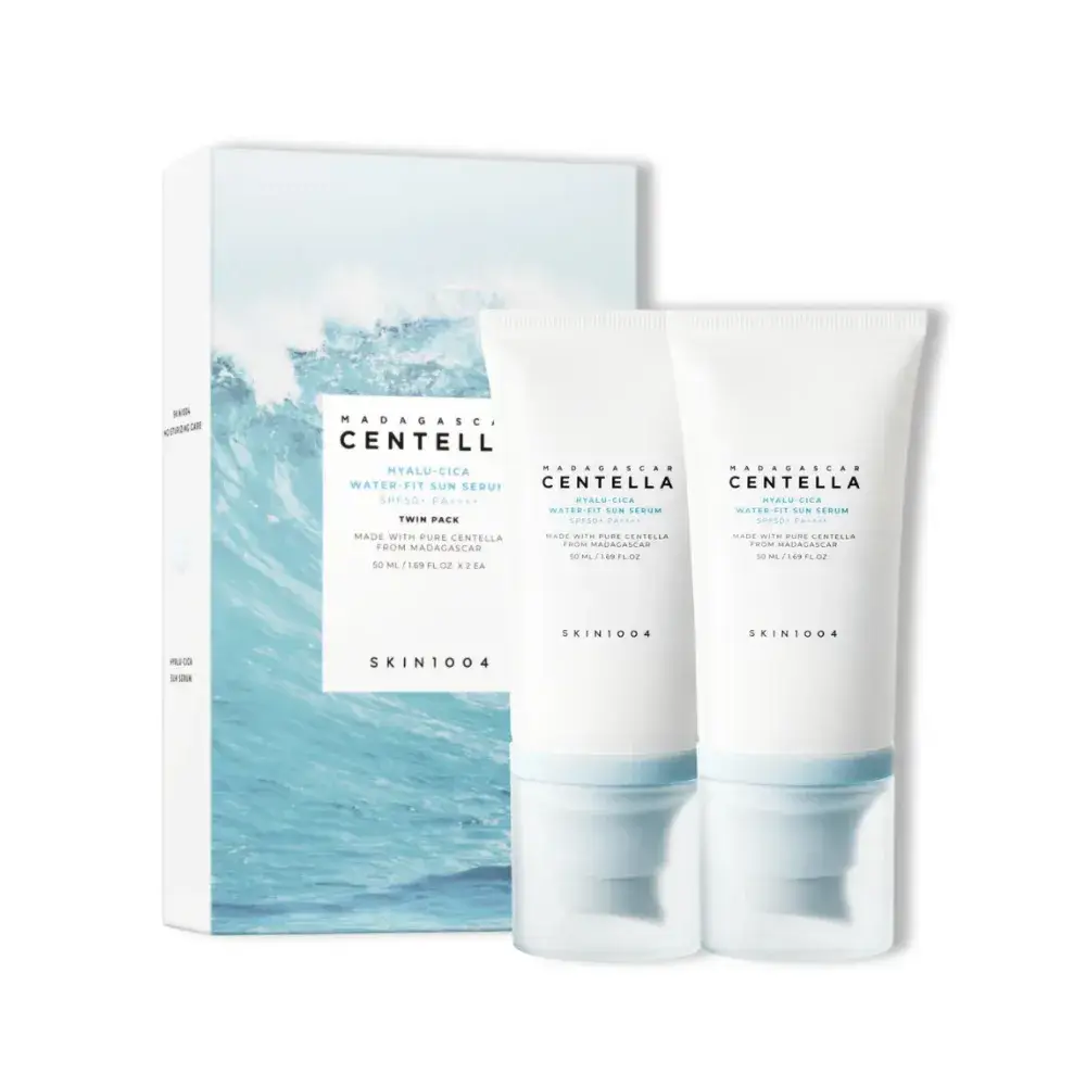 The skin1004 – madagascar centella hyalu-cica water-fit sun serum combines Centella Asiatica extract with hyaluronic acid to deliver hydration and calming care while shielding the skin from harmful UVA and UVB rays.
